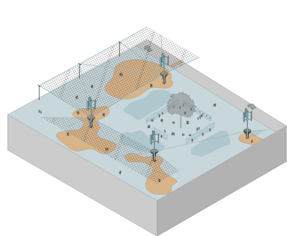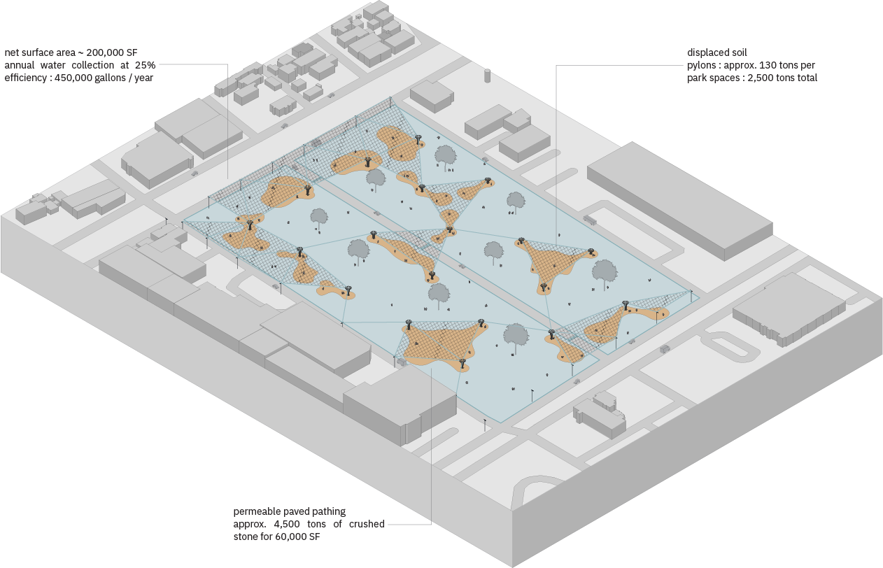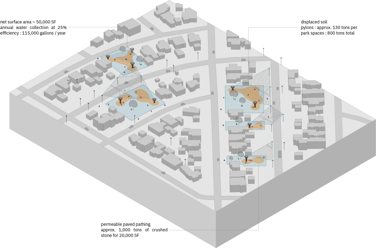 In residential neighborhoods, where lots are smaller and scattered, the nets are anchored across clusters of adjacent parcels and underutilized spaces. Each pylon similarly serves as a physical support and a mechanical pump system, moving collected water from above into subsurface infiltration zones, bypassing surface runoff routes and delivering moisture directly to the aquifer. Beneath the netting, intimate park spaces with permeable paving emerge – designed for gathering, rest, and everyday neighborhood use. Open, uncovered areas are converted into planted commons that absorb overflow and support play and recreation.