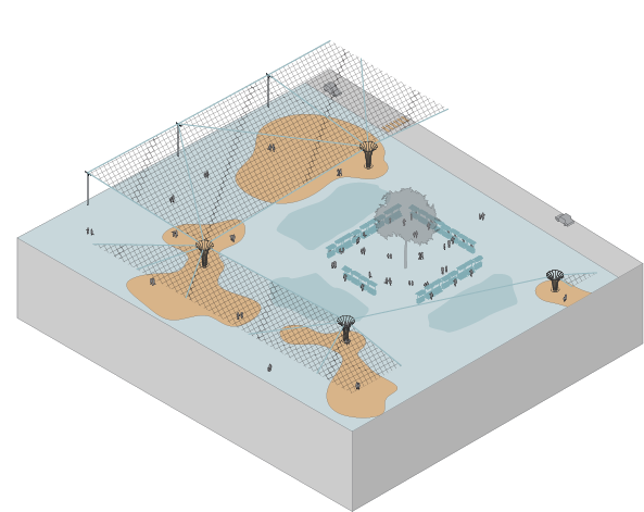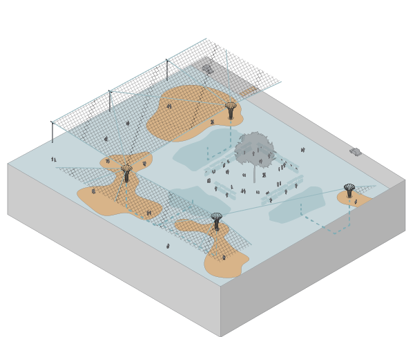 Through a network of Aerial Stormwater Nets suspended across the urban fabric, we seek to expand our interaction with water into the sky itself, capturing atmospheric moisture and rainfall before it ever touches the surface. By doing so, we dissolve the invisible boundary that has confined our hydrological infrastructure to the ground, opening new spatial and temporal dimensions for flood control, recharge, and urban weathering.
