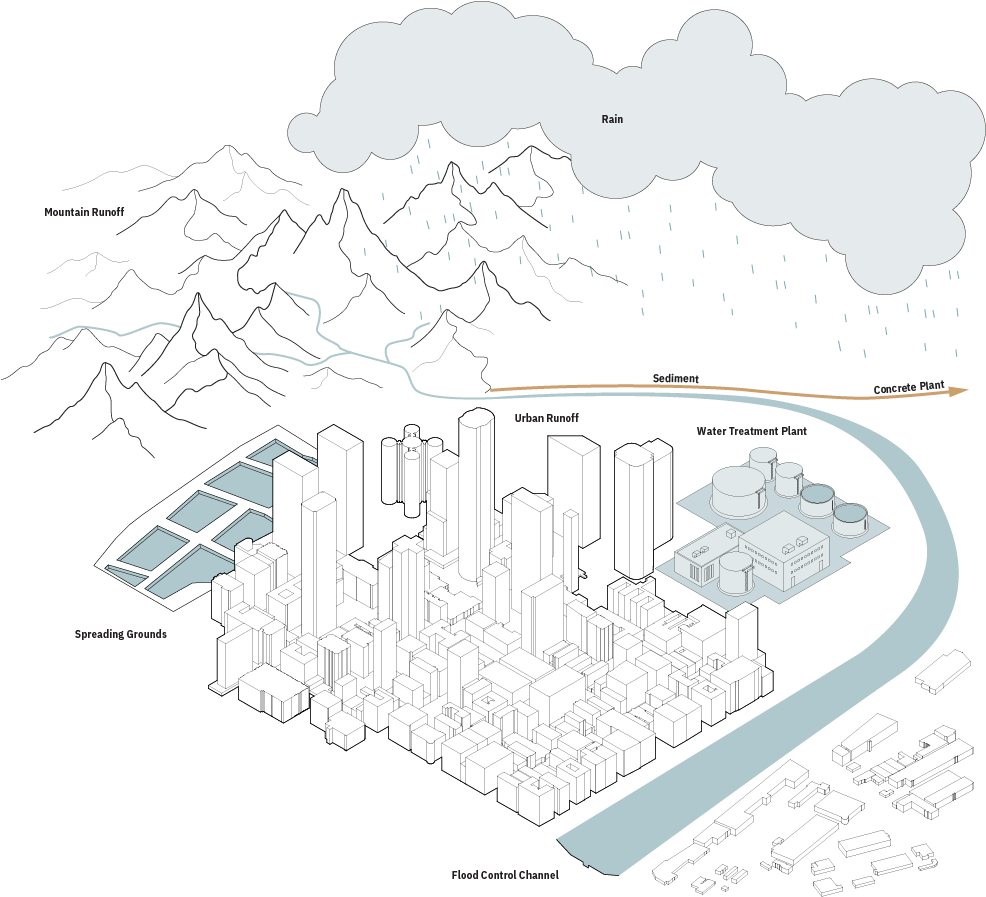 In Los Angeles, our relationship with water is narrowly defined – we only engage with it once it reaches the ground, channeled into engineered flows. This proposal challenges that limitation by expanding from the existing boundary of human interactions we have with water.