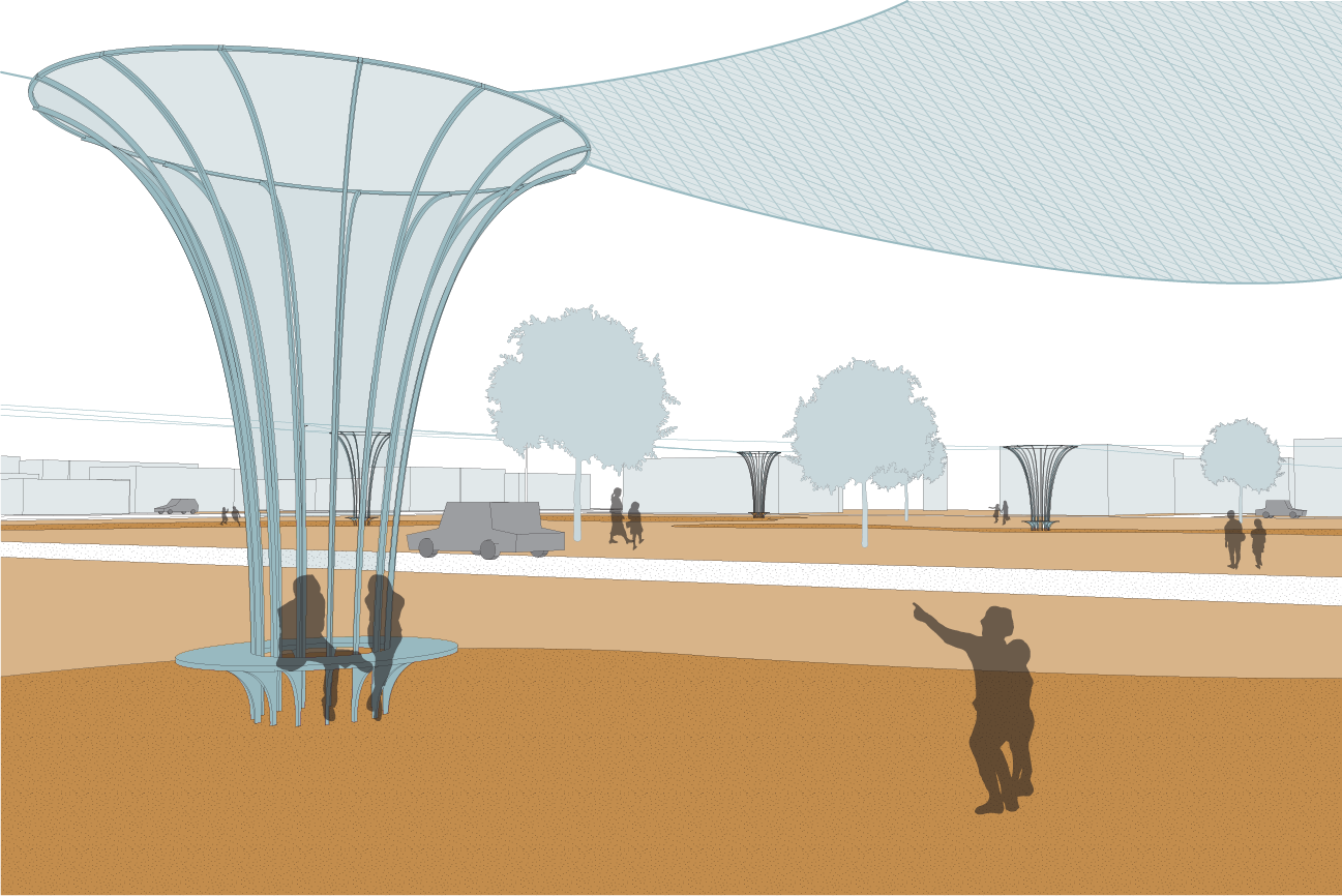 In large commercial lots, the Aerial Stormwater Nets are deployed as high-volume collection systems. Elevated net arrays harvest atmospheric moisture and direct it downward through pylons that double as structural anchors and mechanical infrastructure. Inside each pylon, a pump system transfers the collected water into subgrade recharge shafts, ensuring direct infiltration into the aquifer below. Beneath the net canopy, former heat islands are reimagined as shaded community parks with permeable paving that supports both infiltration and recreation. Areas not covered by nets are converted into green gathering spaces landscaped for play and passive use, where community members can witness the collection and recharge process in real time.